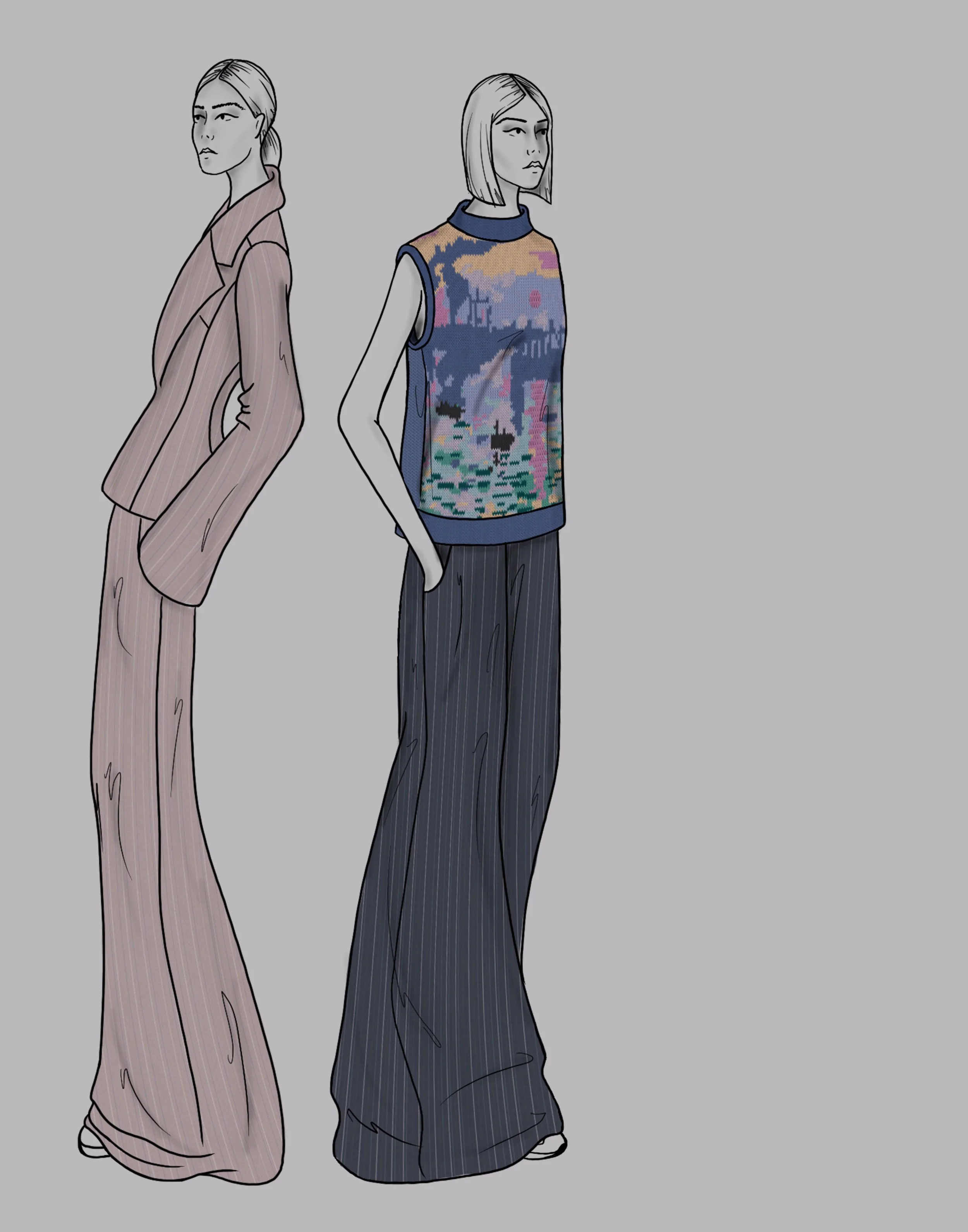 These woven, printed and intarsia knit textiles were created using digital programs Kaledo Weave, Kaledo Print and Kaledo Knit then filled into flats created on Adobe Illustrator.